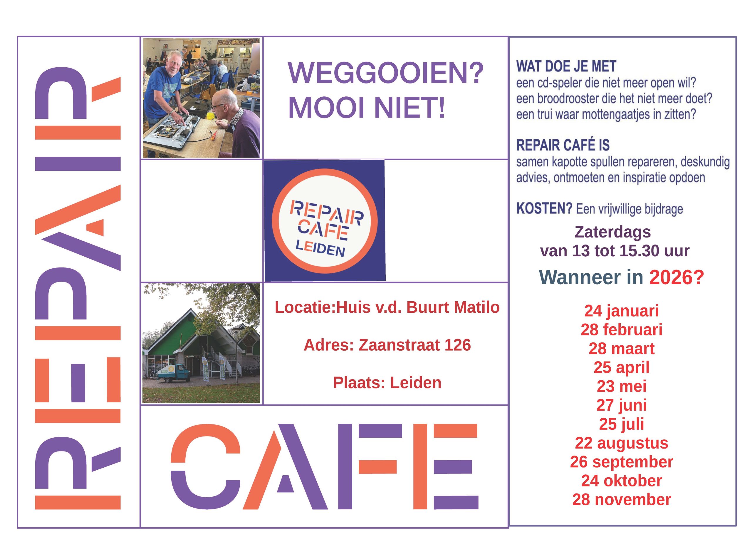 - Het Repair Café is iedere 4e zaterdag open in het huis van de buurt Matilo, van 13.00 tot 15.30 uur.